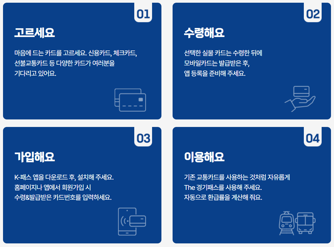 K패스에 경기도의 혜택을 더한 카드로 K카드 발급 후 K패스 홈페이지 또는 앱을 통해 회원가입 후 이용이 가능합니다.