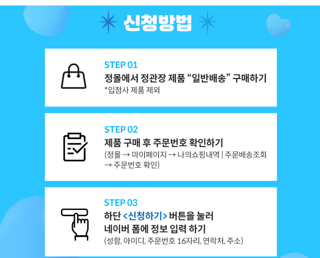 👉 정몰에서 정관제 제품 구매 후, 하단 임영웅 굿즈 신청하기 버튼을 눌러 네이버 폼에 정보 입력 제품준비 완료 문자를 받으면 신청한 방문매장으로 방문하시면 됩니다. (네이버 폼 꼭 작성하셔야 경품을 받을 수 있습니다.)